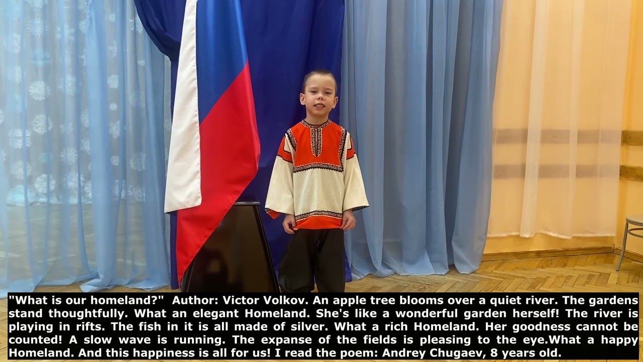 Международный конкурс «Расскажи миру о своей Родине» — проект по патриотическому воспитанию детей и молодёжи и формированию дружественных международных связей между подрастающими поколениями разных стран. «Меня зовут Андрей, я учусь в школе. В школе мне нравится урок литературного чтения, и я люблю учить наизусть стихотворения русских писателей. Особенно мне нравится читать стихотворения о России. Одно из них я представляю в данном конкурсе!»