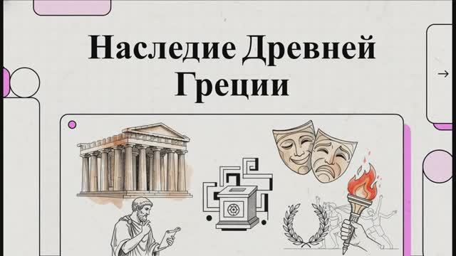 В видео отражены ключевые этапы развития античной цивилизации: от первых государств на Крите и в Микенах до эпохи эллинизма и походов Александра Македонского