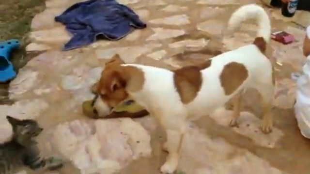 Котенок играет с обезьянкой