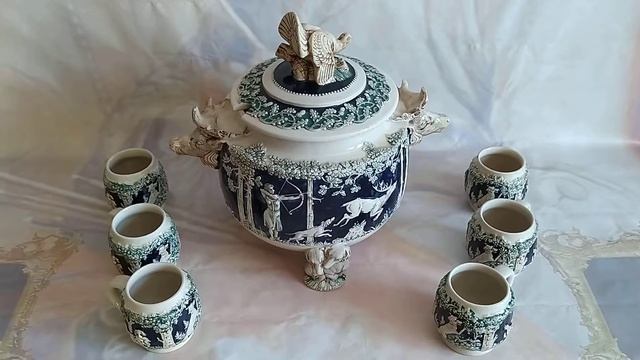 Самый шикарный и один из самых редких наборов для крюшона. Сейчас за частую используют для подачи тушеного мяса, шашлыка, пельменей и т.д. Стиль "Jager". Изготовлен в Германии фирмой Wick Werke A.G в 1921-1937 году. ( датировка клеймом) - Время прихода к власти Гитлера. Клейма на кружках и самой крюшоннице. Объем 5 литров , кружки по 250 мл. Керамика в глазури.