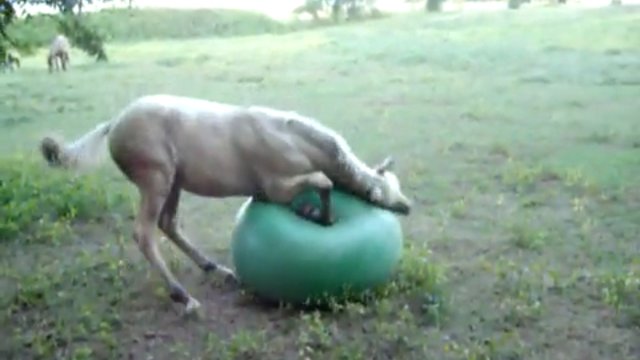 Играет в мячик, кувыркается и, конечно, падает всем своим весом