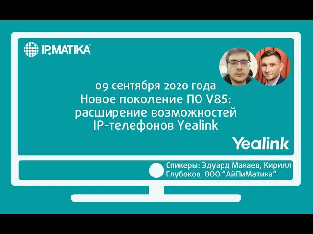 9 сентября 2020 года пресейл-инженер по телефонным решениям Эдуард Макаев и специалист технической поддержки абонентского оборудования компании АйПиМатика Кирилл Глубоков провели вебинар "Новое поколение ПО V85: расширение возможностей IP-телефонов Yealink". Спикеры познакомили участников мероприятия с новым ПО V85 и возможностью его получения для обновления телефонов Yealink. Улучшенный функционал: - поддержка до 10 участников смешанных конференций; - оптимизированная поддержка конференц- и настольных DECT-телефонов; - ускоренное время загрузки; - единая прошивка; - больше устройств по Bluetooth. Новые функции: - технология "умной" фильтрации шума Smart Noise Filtering; - IP-телефон как точка доступа Wi-Fi; - передача сети на ПК; - сигнал о потере сети; - возможность ТФОП-соединения; - поддержка Android ID & Google Contacts.