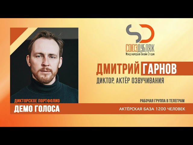 #СоюзДубляж #БазаДикторов #Озвучка ✔️Дмитрий Гарнов, диктор озвучивания. Международная Онлайн-Студия "СОЮЗДУБЛЯЖ" - профессиональная озвучка и дубляж. ▪️Рабочая группа в Телеграм: https://t.me/soyuzdubliazh ▪️Контакт для связи: https://t.me/SoyuzAdmin ▪️Подпишись:https://www.youtube.com/c/SOYUZDUBLIAZH ▪️Сайт: https://www.soyuzdubliazh.com/ Лучшие голоса для вашей аудиорекламы и видеороликов. База дикторов - 5 000 человек, профессионального уровня на ENG| FR| TR| RU| ISR| AZ| UA| KZ| UZ| языках. Мужские и Женские топовые голоса для озвучки любых проектов, таких как: Рекламы, Презентации, Фильмы, Сериалы, Игры, Мультфильмы, ТВ Шоу, Аудио-видео визитки. ✔️Сотрудничая с нами вы получаете свой проект под ключ, не выходя из дома или офиса. Наша слаженная команда из лучших дикторов, актёров озвучивания, режиссёров и звукорежиссёров в кратчайшие сроки озвучат или отдублируют ваш заказ на профессиональном уровне. Образцы работ нашего портфолио вы сможете посмотреть на канале СОЮЗДУБЛЯЖ. ВНИМАНИЕ: ✔️Мы приглашаем специалистов озвучки к сотрудничеству в нашей команде. Вы можете пройти по ссылке в наш телеграм канал и связаться с Админом для обсуждения. ✔️Всем заказчикам подобных медиа проектов по озвучки и дубляжу фильмов, сериалов, документалок обращаться непосредственно к Админу Телеграм группы СОЮЗДУБЛЯЖ, пройдя по ссылке: Проходи по ссылке: https://t.me/soyuzdubliazh International Online-Studio SOYUZDUDLIAZH presents a highly professional approach in voice-over and dubbing. ▪️Our working group https://t.me/soyuzdubliazh ▪️Chief manager https://t.me/SoyuzAdmin ▪️Follow https://www.youtube.com/c/SOYUZDUDLIAZH ▪️Web: https://www.soyuzdubliazh.com/ We offer You the best Voices for your Audio commercials and Video`s. Our Database contains over 5 000 voices of native speakers and high-class foreign language specialists in ENG| FR| TR| RU| ISR| AZ| UA| KZ| UZ|. Male & Female top level voices for all the variety of dubbing projects such as commercials, presentations, movies, TV-series, video and computer games, cartoons, TV-shows, audio & video portfolio’s – all in one place. As your business partner we guarantee a turn-key project without you leaving your house or office. Our target is to make sure that the dubbing of your project is made as quick as possible by a well-coordinated and professional team of the best speakers, film and sound directors. To whom it may concern! We invite dubbing specialists to join our team. Please contact our manager on Telegram https://t.me/soyuzdubliazh