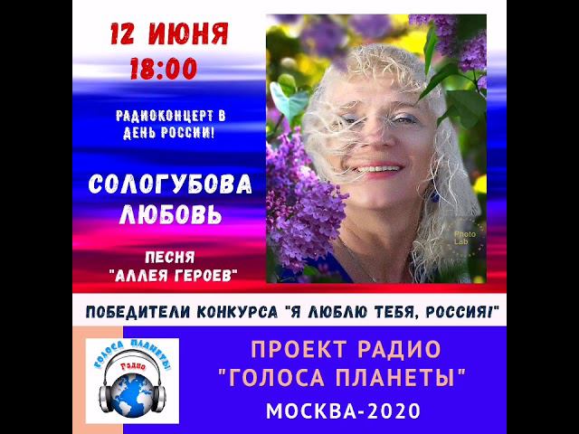 Сологубова Любовь - победитель конкурса "Я люблю тебя, Россия"! На Радио "Голоса планеты" полным ходом идёт Всероссийский музыкальный конкурс "Я люблю тебя, Россия!" Лучшие исполнители, претендующие не только на оценку их творчества, но и также желающие принять участие в радиоконцерте 12 июня в 18:00 на волнах нашего радио присылают свои заявки, и завоевав высший балл получают путёвку на Радио! Встречаем победительницу конкурса в номинации "Авторская песня" - Сологубову Любовь из города Волгограда с песней "Аллея Героев" (автор музыки и слов - Любовь Сологубова). Мы от души поздравляем Сологубову Любовь с победой и желаем ей новых творческих свершений! И сегодня представляем вашему вниманию песню "Аллея Героев", которая прозвучит на Радио в День России!