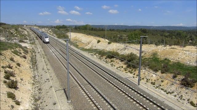 Скоростная железная дорога. Летит скоростной поезд на максимальной скорости в Европе Франция