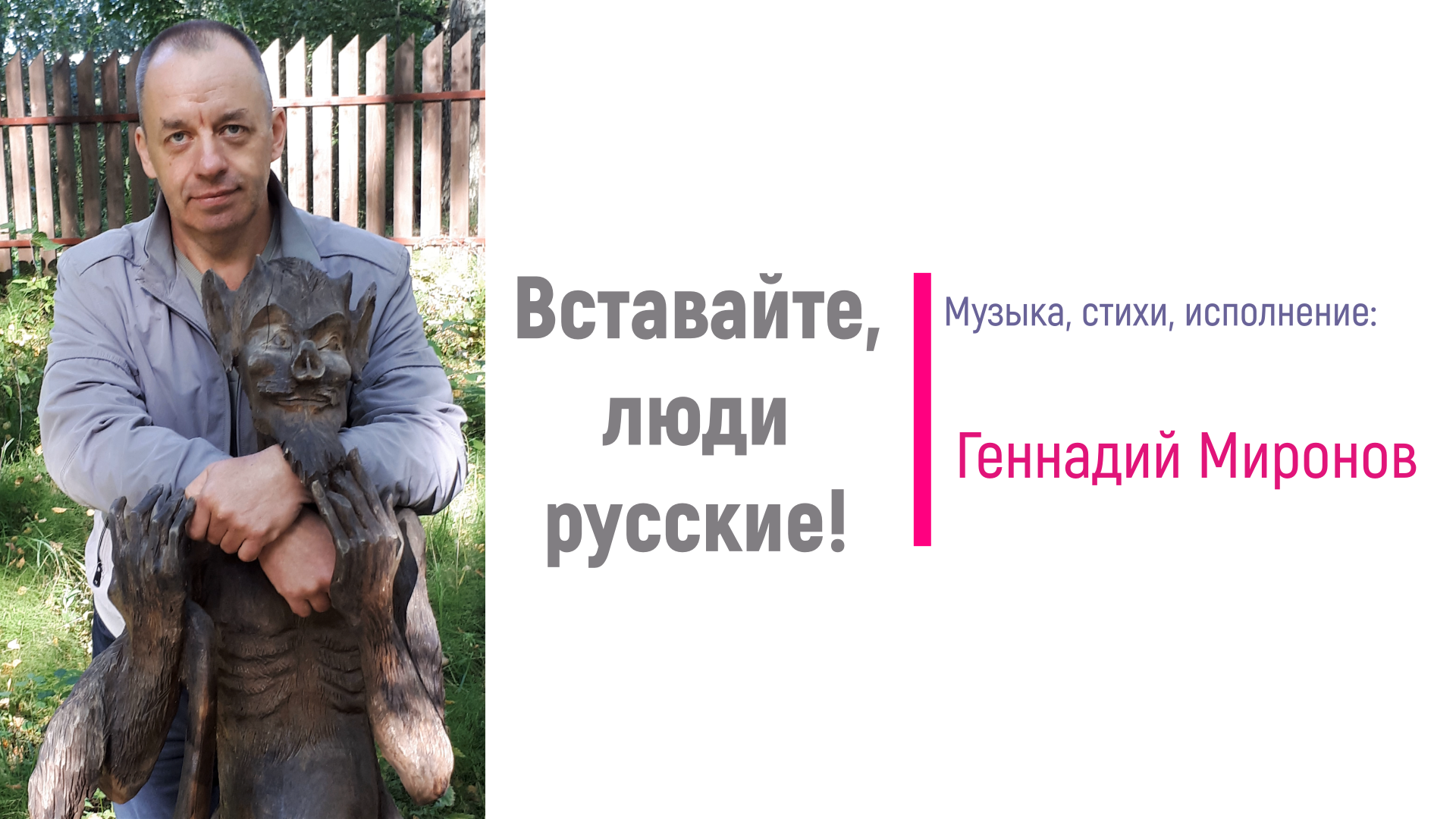 Вставайте, люди русские! Вперёд бок о бок с братьями! Народов разных воины - мы все одна семья! Врага сметём безжалостно, сопроводив проклятьями Мы вместе - сила грозная! И ты, и он, и я! Мы все - страна огромная, бескрайняя, великая И свято слово "Родина" во всех концах страны Такая непохожая, такая многоликая Но мы - семья единая и этим мы сильны С востока и до запада страна единством славится От южных гор заснеженных, до северных морей Собралась сила грозная, на бой святой отправиться Чтоб встать за землю русскую, за жён и матерей! Вставайте, люди русские! Вставайте все, коль дорого Всё то, что нам завещано! За свет и против тьмы! Встав в строй бок о бок с братьями, сразим любого ворога! Мы все - сыны Отечества! Её опора - мы!
