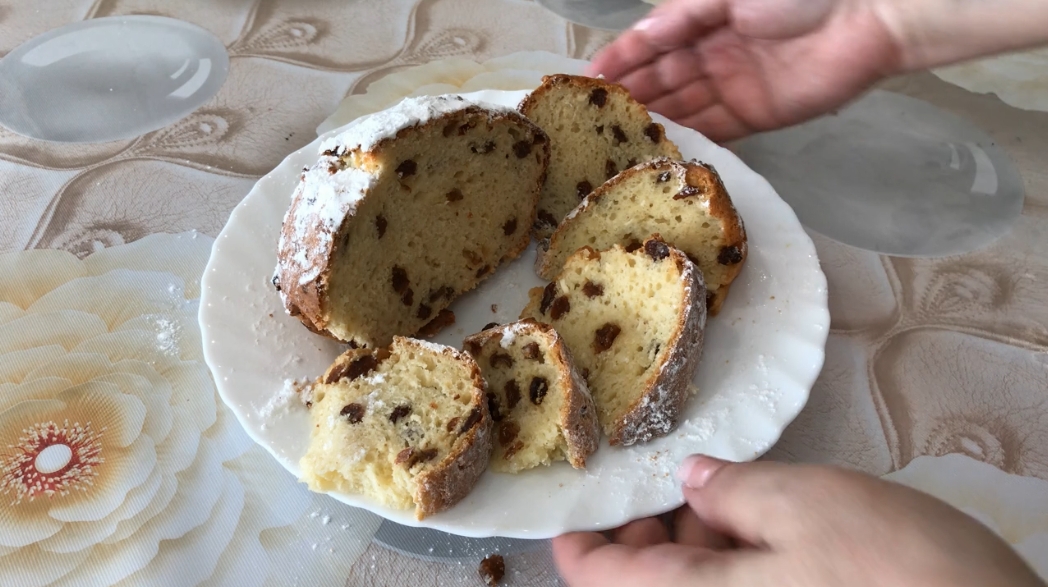 Яйцо - 2 шт Сахар - 100 грамм (4 ст.л) Ванильный сахар - 1 ч.л. Соль щепотка Творог - 130 грамм Мука - 150 грамм (0,90 стакана или 5 ст.л.) Разрыхлитель - 1 ч.л. Изюм - 80 грамм Выпекать при 180°С 35 - 40 минут