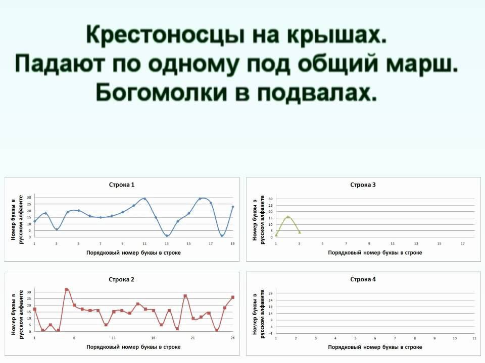 Стихотворение в данном случае представлено в виде графика. По оси абсцисс расположен по-рядковый номер буквы в строке, а по оси ординат номер буквы в русском алфавите. в итоге мы получаем индивидуальные графики для каждого стихотворения и более того для каждой отдель-ной строки. Графики, естественно, довольно-таки сильно отличаются друг от друга и могут быть использованы для идентификации произведения без самого текста.