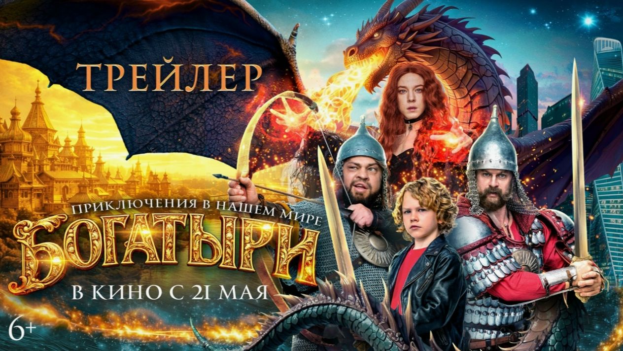 Богатыри - Трейлер Год производства 2026 Страна Россия Жанр комедия, семейный, фэнтези Премьера в России 21 мая 2026 Возраст 6+ «Богатыри» (2026) — российское комедийно-приключенческое фэнтези. В качестве режиссера и сценариста фильма выступил Павел Воронин («Я хочу! Я буду!»). В актерский состав картины вошли Роман Курцын, Роман Постовалов, Карина Разумовская, Никита Тарасов и другие. В давние времена легендарный Святогор победил колдуна Терона, приняв облик Дракона. А чтобы зло не вернулось, он перенес три артефакта Дракона в далекое будущее и спрятал там. Однажды школьник Ваня, который очень любит старинные сказания и легенды, попадает в прошлое. Там он встречает смелых древнерусских витязей — Федора и Ратибора. Вскоре они узнают, что колдунья Гордея задумала воскресить злобного мага, использовав коготь, глаз и жилу. Мальчик вместе с богатырями переносится на сотни лет вперед, чтобы помешать коварному замыслу. В будущем героев ждут увлекательные и опасные приключения. Смогут ли они спасти мир от зла?