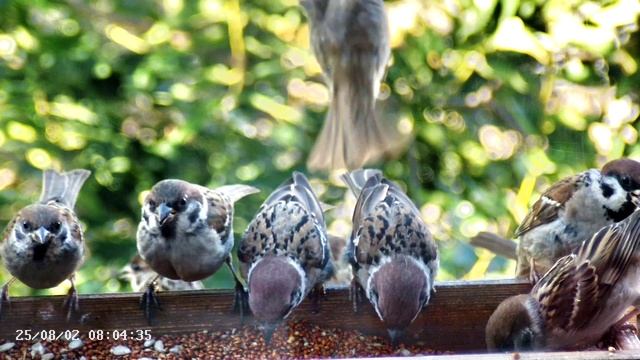 Свежий завтрак в кормушке с воробьями