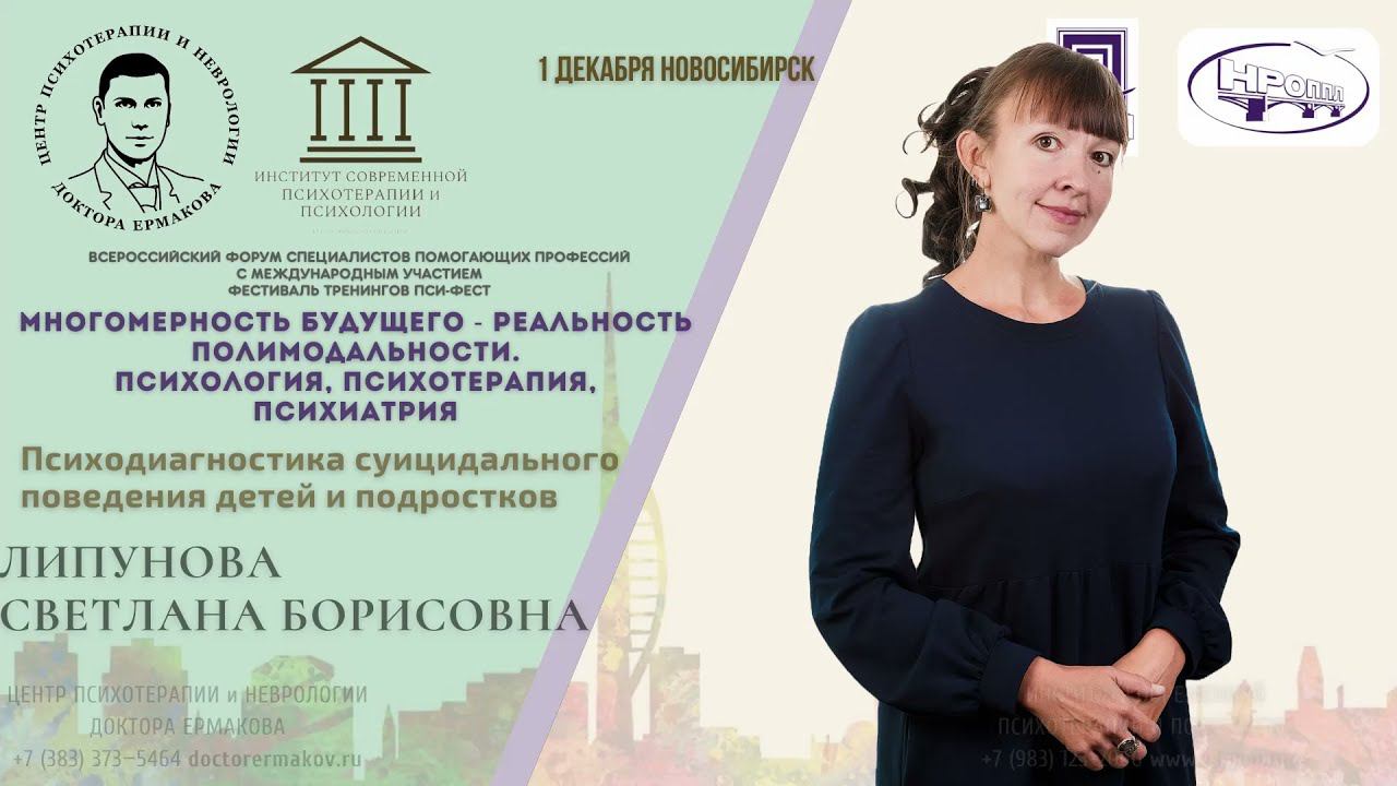 Липунова Светлана Борисовна – клинический психолог, патопсихолог Центра психотерапии и неврологии Доктора Ермакова (Новосибирск, Россия) • Проблема аутоагрессивного поведения среди детей и подростков • Маркеры суицидального риска • Роль психологической диагностики в профилактике и коррекции суицидального поведения детей и подростков • Методы и методики индивидуальной и групповой психологической диагностики суицидального риска, намерений и поведения • Диагностический инструментарий, рекомендуемый для проведения скрининговой диагностики • Углубленная диагностика риска суицидального поведения Центр психотерапии доктора Ермакова и Институт современной психотерапии и психологии представляет секцию «Современные тенденции в психотерапии и психологическом консультировании». Всероссийский форум специалистов помогающих профессий с международным участием "Многомерность будущего - реальность полимодальности. Психология, психотерапия, психиатрия." и День ОТКРЫТЫХ ДВЕРЕЙ ИНСТИТУТА СОВРЕМЕННОЙ ПСИХОТЕРАПИИ И ПСИХОЛОГИИ. Дата мероприятия: 1 декабря