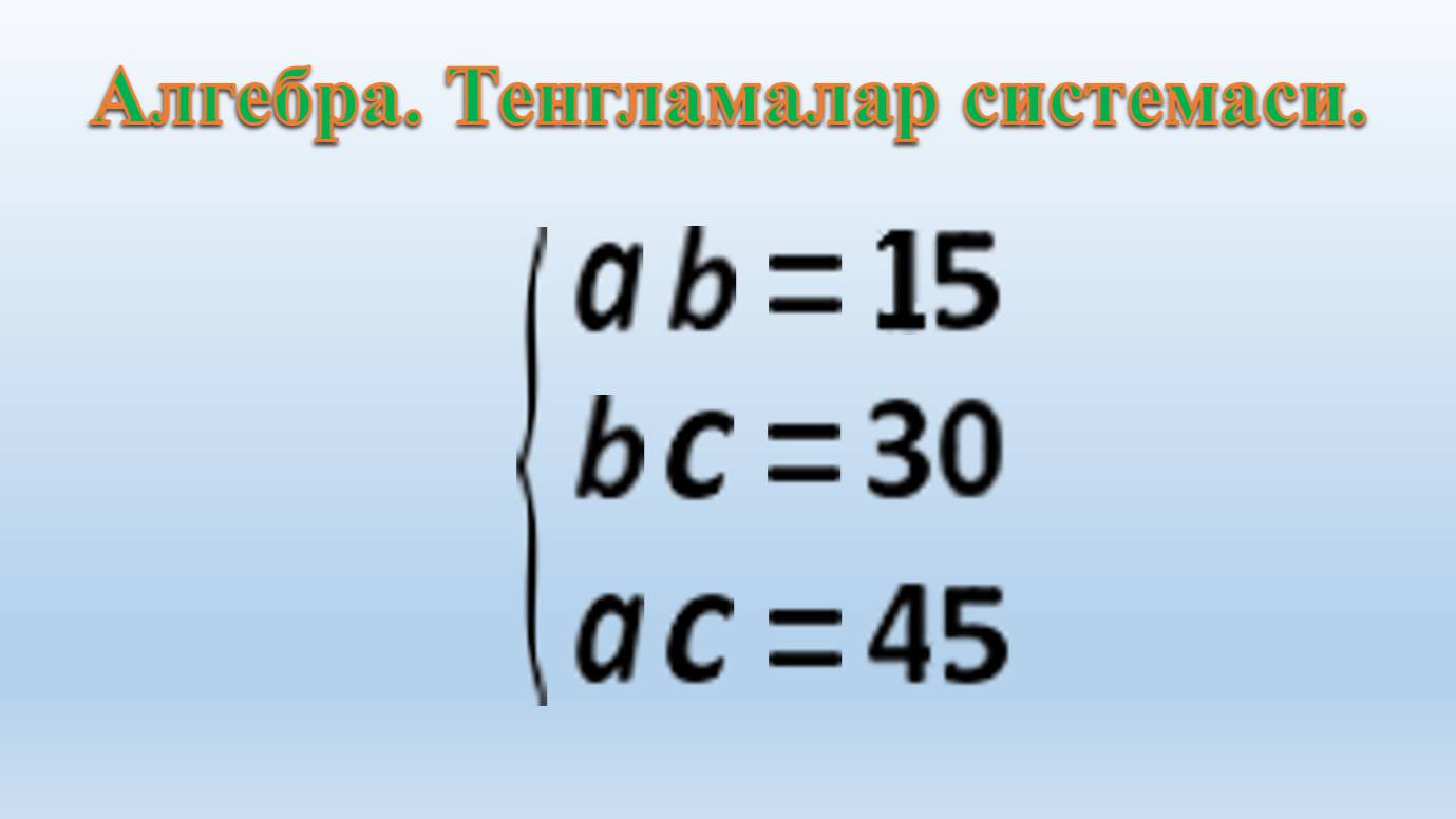 Algebra. Tenglamalar sistemasi: ɑ・b = 15 ва b・c = 30 ва ɑ・c = 45