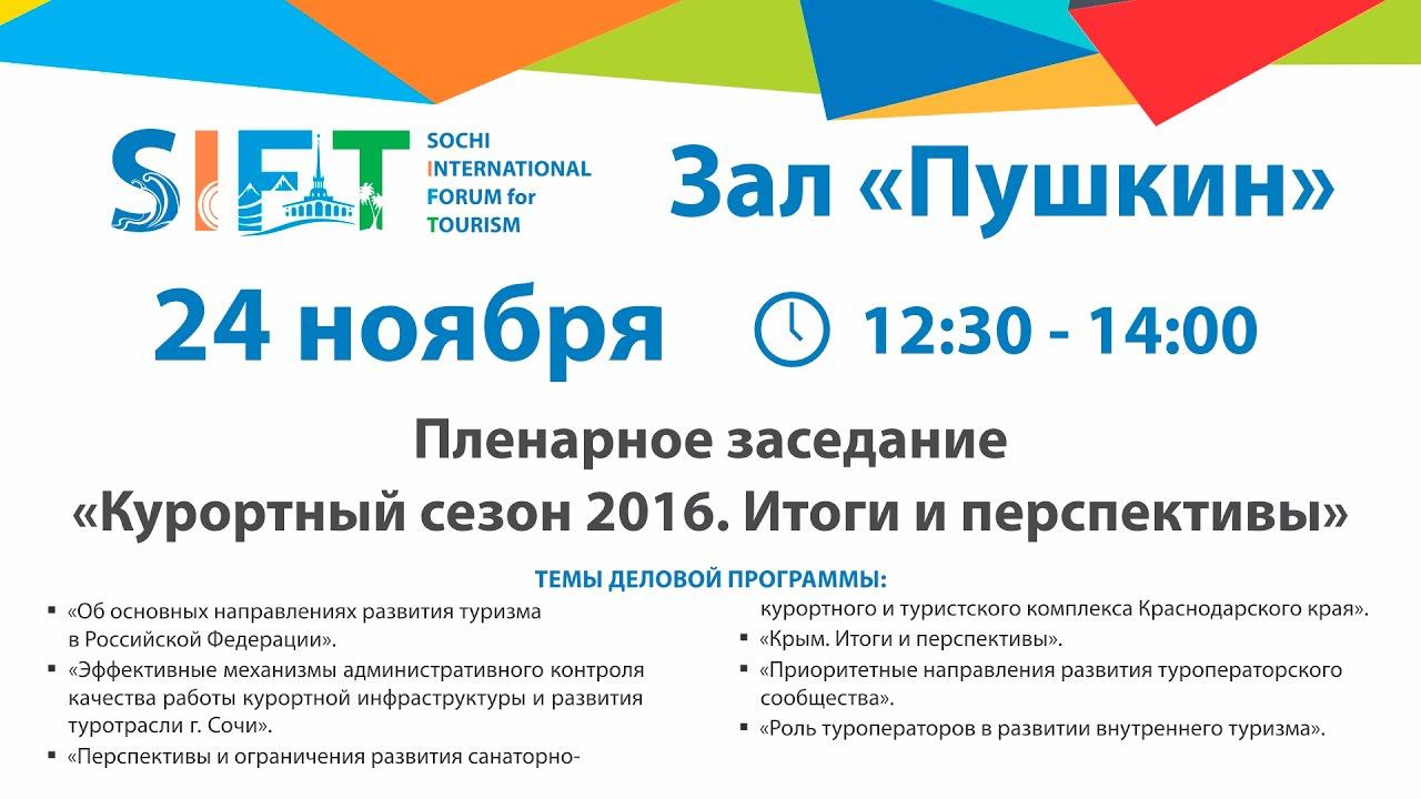 Пленарное заседание «Курортный сезон 2016. Итоги и перспективы» Модератор: Александр Елисеев, директор по развитию телеканала RTG TV. Приветственное слово И.Е. Левитина, помощник Президента РФ. Приветственное слово В.И. Кондратьева, Губернатора (Главы администрации) Краснодарского Края. Приветственное слово С.В. Кривоносова, депутата ГД ФС РФ. Тема: «Об основных направлениях развития туризма в Российской Федерации». Спикер: Сафонов О.П., Руководитель Федерального агентства по туризму. Тема: «Эффективные механизмы административного контроля качества работы курортной инфраструктуры и развития туротрасли г. Сочи». Спикер: Пахомов А.Н., Глава города-курорта Сочи. Тема: «Перспективы и ограничения развития санаторно-курортного и туристского комплекса Краснодарского края» Спикер: Константиниди Х.А., министр курортов, туризма и олимпийского наследия Краснодарского края. Тема: «Крым. Итоги и перспективы». Спикер: Стрельбицкий С.В., министр курортов и туризма Республики Крым. Тема: «Приоритетные направления развития туроператорского сообщества». Спикер: Барзыкин Ю.А., председатель Комитета по предпринимательству в сфере туристской, курортно-рекреационной и гостиничной деятельности, Российский союз промышленников и предпринимателей, Торгово-промышленная палата России. Тема: «Роль туроператоров в развитии внутреннего туризма». Спикер: Уманский И.Г., генеральный директор Национального туроператора «АЛЕАН». Тема: «Роль аэропортов в развитии внутреннего ивъездного туризма». Спикер: Сергеев Л.В., генеральный директор «Базэл Аэро». Тема: «Перспективы увеличения турпотока во внутреннем и въездном туризме». Спикер: Майа Ломидзе, исполнительный директор Ассоциации Туроператоров России. Место проведения: зал «Пушкин» Международный туристский форум в Сочи SIFT-2016 http://tour-forum.com/