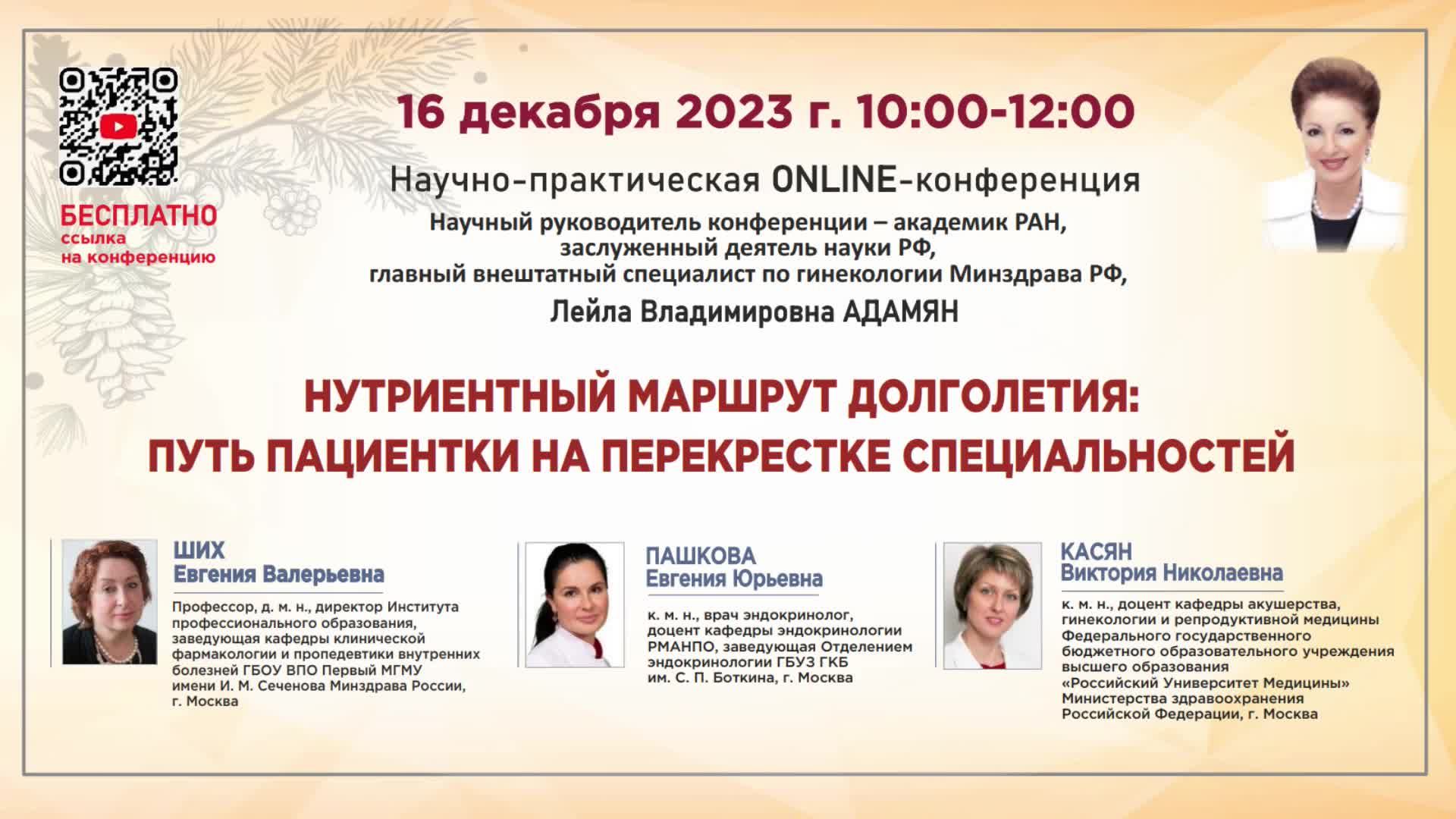 После 40 лет женщина вступает в новый жизненный этап. Начинается постепенный переход организма от половой зрелости к прекращению генеративной функции яичников. Происходят серьезные изменения, связанные с дефицитом половых гормонов, которые могут проявляться вазомоторной и психоэмоциональной симптоматикой, метаболическими нарушениями, хроническим воспалением, повышать риски развития остеопении, остеопороза и саркопении. Каждая женщина проходит этот период «по-своему». Очень важно, чтобы на этом непростом пути ее сопровождали врачи самых разных специальностей, оказав ей качественную поддержку. Наши главные эксперты помогут разобраться в вопросе: Как улучшить качество и продолжительность жизни с помощью нутриентной поддержки? Взгляд клинического фармаколога, гинеколога, эндокринолога на ведение женщин в период гормональных нарушений 40+. Об этом и многом другом мы поговорим на предстоящей конференции. Будем искренне рады Вашему участию! Спикеры: Ших Евгения Валерьевна Профессор, д. м. н., директор Института профессионального образования, заведующая кафедры клинической фармакологии и пропедевтики внутренних болезней ГБОУ ВПО Первый МГМУ имени И.М. Сеченова Минздрава России, г. Москва Пашкова Евгения Юрьевна к.м.н., врач эндокринолог, доцент кафедры эндокринологии РМАНПО, заведующая Отделением эндокринологии ГБУЗ ГКБ им. С.П. Боткина, Москва Касян Виктория Николаевна к. м. н., доцент кафедры акушерства, гинекологии и репродуктивной медицины Федерального государственного бюджетного образовательного учреждения высшего образования «Российский Университет Медицины» Министерства здравоохранения Российской Федерации, г. Москва Программа конференции: 10:00 - 10:20 Открытие мероприятия. Вступительное слово научного руководителя совещания (Адамян Лейла Владимировна) 10:20 - 10:40 «Рациональные подходы к выбору нутриентов для реализации стратегии управления возрастом» ( Ших Евгения Валерьевна ) 10:40 - 11:00 «Отбросить лишнее: сохраняем стройность в элегантном возрасте» ( Пашкова Евгения Юрьевна ) 11:00-11:20 «Женщина в переходном периоде 40+: современные тренды поддержания здоровья» ( Касян Виктория Николаевна ) 11:20-12:00 ДИСКУССИЯ. ЗАКЛЮЧИТЕЛЬНЫЕ СЛОВА ЭКСПЕРТОВ Адамян Л.В., Ших Е.В., Пашкова Е.Ю., Касян В.Н.