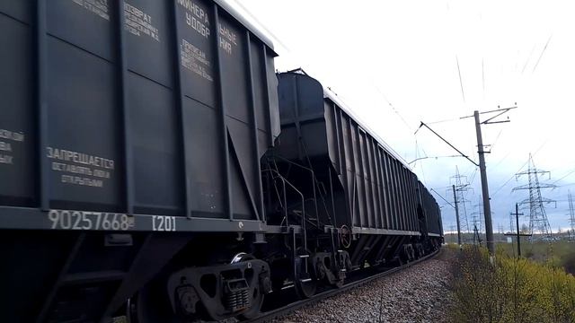 Я очень люблю поезда. Сегодня мне посчастливилось снять грузовой электровоз 2ЭС4К ехавший по Парнасской железной дороги. Он имеет две секции. Два белых буферных фонаря означает движение электровоза по основному пути сейчас он вёз хопперы - вагоны для минеральных удобрений. Они имеют люки для загрузки. Потом люки закрываются, а разгружается вагон через низ.