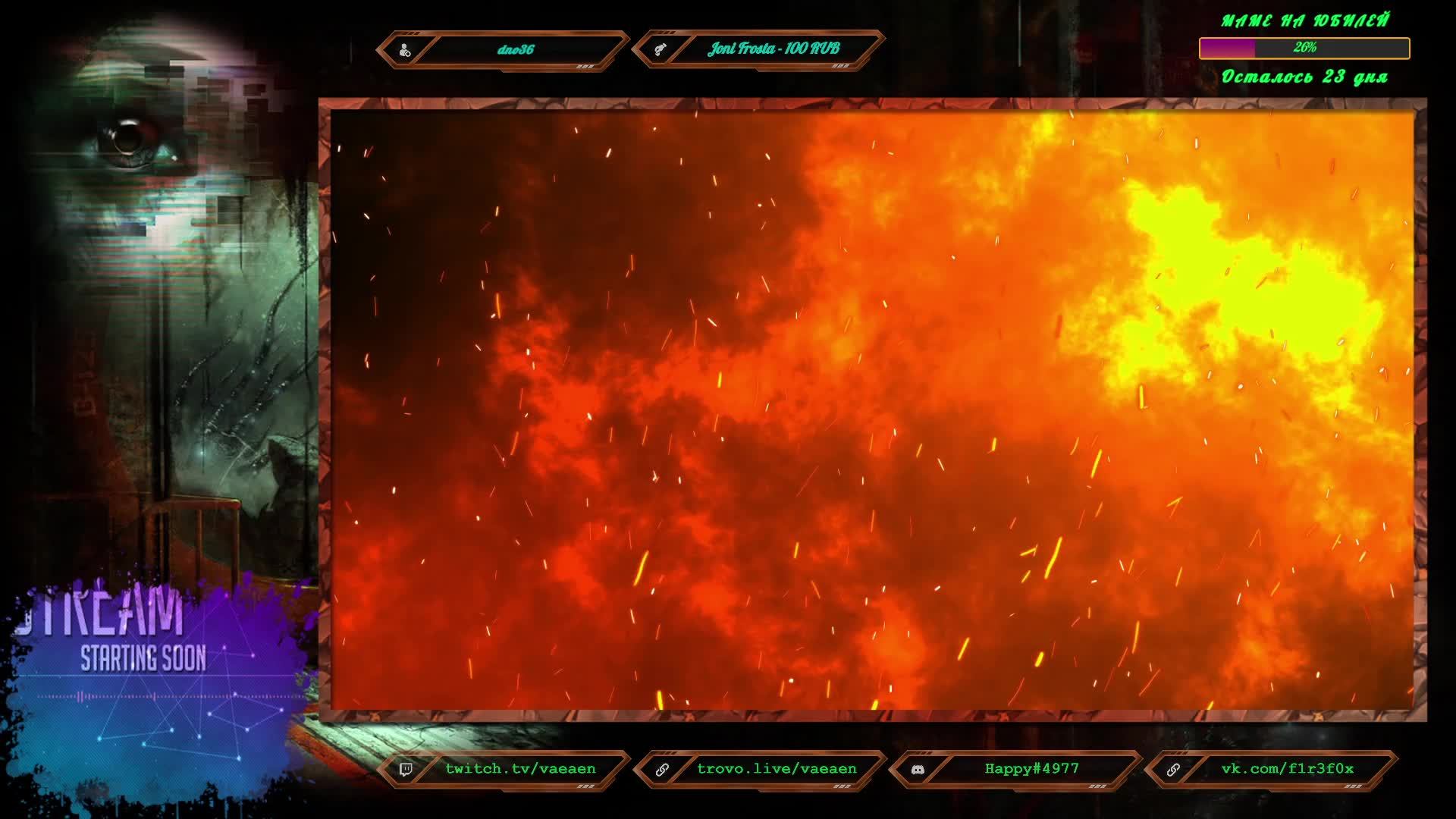 Если хотите поддержать меня как стримера - нажмите по данной ссылке! https://www.donationalerts.com/r/f1r3f0x Во время стрима ваше сообщение появится на экране, и будет сопровождаться голосовым диктором. Поддержка на Boosty - https://boosty.to/vaeaen Поддержка без комиссии: 2202 2010 0629 1039 Основные каналы: Twitch: https://www.twitch.tv/vaeaen Trovo: https://trovo.live/Vaeaen GoodGame: https://goodgame.ru/channel/Vaeaen/