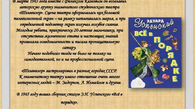 К 85-летию со дня рождения российского писателя и автора детских книг Эдуарда Николаевича Успенского заведующий филиалом библиотеки № 46 подготовила видеоролик «Юбилей писателя – радость для читателя!»
