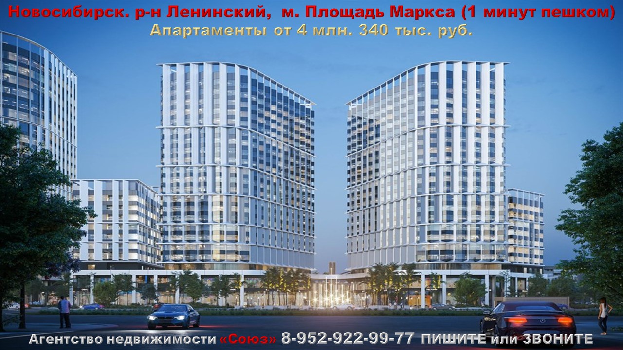 Каталог новостроек Новосибирска - https://nedvigimoct.allrealty.pro/?regionId=54#catalog Агентство недвижимости «СОЮЗ» Покупайте: апартаменты в Новосибирске. р-н Ленинский, м. Площадь Маркса (1 минут пешком) Агент по новостройкам: 89529229977 (WhatsApp) Цены на апартаменты точно такие же как и у застройщика. Апартаменты продаются БЕЗ РИЭЛТОРСКОЙ КОМИССИИ !!!. Ст. квартиры: от 4 млн. 340 тыс. руб. Ежемесячный платеж: 25 444 руб. при ставке 8% Площадь общая: 21,28 м2 - 26,01 м2 1к. квартиры: от 6 млн. 540 тыс. руб. Ежемесячный платеж: 38 343 руб. при ставке 8% Площадь общая: 36,96 м2 - 60,39 м2 2к. квартиры: от 8 млн. 250 тыс. руб. Ежемесячный платеж: 48 368 руб. при ставке 8% Площадь общая: 47,89 м2 - 51,06 м2 Срок сдачи: 2 квартал 2026 - 4 квартал 2026 Срок выдачи ключей: 4 квартал 2026 - 2 квартал 2027 Договор: ДДУ Тип дома:кирпично-монолитный Тип отделки: подготовка под чистовую отделку Парковка: есть Потолки: 2,7 м. Преимущества:Престижный район. Развитая транспортная инфраструктура. Развитая социальная инфраструктура. Рядом метро. Мультиформатность квартала. Описание комплекса: На левом берегу Новосибирска, на площади Маркса, возводится квартал, чтобы дать старт трансформации нового центра мегаполиса. В этой свободе нет места маршрутам, длительностью дольше 5 минут. Прогрессивная инфраструктура для каждого — ответ на динамичное развитие берега. Квартал объединяет в себе все функциональные зоны, востребованные в современном городе, раскрывает потенциал площади Карла Маркса, превращая ее в новый центр мегаполиса. Площадь Карла Маркса изначально проектировалась как центр новосибирского левобережья. Она окружена крупными магистралями и связана с правым берегом проспектом Карла Маркса и Октябрьским мостом. Квартал предлагает продуманные апартаменты для личного пользования или инвестиций. Независимо от размера планировок, здесь рационально используется каждый квадратный метр. Каждое здание здесь несет свою функциональную нагрузку — это позволяет разделить потоки посетителей, сделать удобным жизнь и работу.