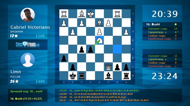 Данное видео было создано мобильным приложением ChessFriends.com **** Понравилось видео? Вы тоже можете создавать такие видео! Просто установите наше приложение, играйте и экспортируйте игры прямо в YouTube. Android: https://play.google.com/store/apps/details?id=chessfriends.online.chess iOS: https://itunes.apple.com/app/chess-online-+/id903978215?mt=8 Windows 8/10: http://apps.microsoft.com/windows/app/ajedrez-online/362ae1c9-5d6f-4824-a9e7-1095b2a95e10 OSX: https://itunes.apple.com/app/chess-online-+/id919607238?l=en&mt=12 Мобильный сайт: http://www.chessfriends.com/mobile?lang=ru_RU Facebook App: https://apps.facebook.com/chessfriendscom Windows Phone: http://apps.microsoft.com/windows/app/ajedrez-online/362ae1c9-5d6f-4824-a9e7-1095b2a95e10 **** Chess Age: Android: https://play.google.com/store/apps/details?id=chess.friends.game.play IOS: https://itunes.apple.com/us/app/chess-age/id1217007613?mt=8 Facebook: https://apps.facebook.com/chessage **** Подпишитесь на ChessFriends.com в YouTube: https://www.youtube.com/subscription_center?add_user=ChessFriendsDotCom Facebook: https://www.facebook.com/ChessFriendscom-127961610576613/?fref=ts **** Игра в формате PGN: [Event "free game"] [Site "www.chessfriends.com"] [Date "2021/4/20"] [Round "none"] [White "Gabriel Victoriano"] [Black "Limn"] [Result "0-1"] [ECO "C44"] [Opening "C44"] [WhiteElo "1106"] [BlackElo "1480"] [WhiteCountry "BR"] [BlackCountry "RU"] [TimeControl "1800000"] 1. e4 e5 2. Nf3 Nc6 3. d3 Nf6 4. Nc3 Bb4 5. Bd2 O-O 6. a3 Bc5 7. g3 Ng4 8. Qe2 Nd4 9. Nxd4 Bxd4 10. Qxg4 d5 11. Qf3 dxe4 12. Qxe4 f5 13. Qd5+ Rf7 14. Qxd8+ Rf8 15. Qxc7 h6 16. Nb5 Bxb2 17. Rb1 Bd4 18. Nxd4 exd4 19. Qc4+ Rf7 20. Rb5 Bd7 21. Rxf5 Bxf5 22. Qxd4 Re8+ 23. Be2 Rd7 24. Qc4+ Kh8 25. O-O Rxe2 26. Qc3 Bh3 27. Re1 Rde7 28. Qb4 R7e6 29. Be3 Rxc2 30. Qh4 Bf5 31. Qd8+ Kh7 32. f3 Bh3 33. Bd4 Rxe1# 0-1