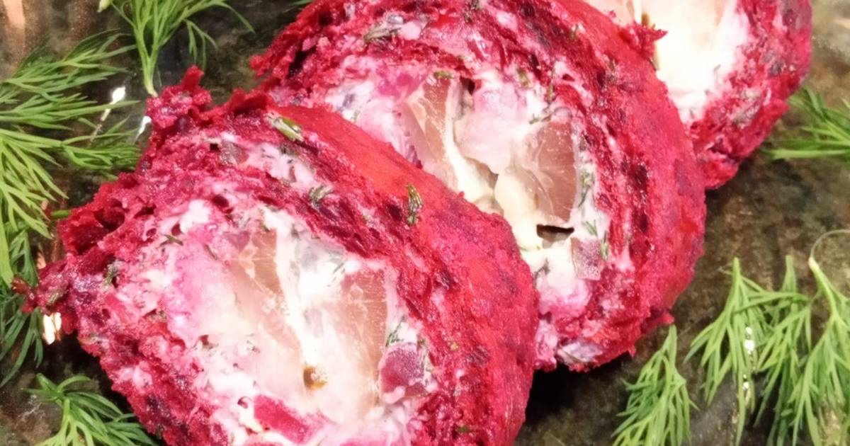 Это закуска украсит любой праздничный стол, она оригинальная по вкусу и яркая цвету . Продукты Сельдь малосольная – 1 шт. Свёкла – 2 шт. (250 г) Яйца – 3 шт. Сыр сливочный – 300 г Огурцы маринованные (маленькие) – 3 шт. Крахмал (или мука) – 80 г Укроп свежий – 1 пучок Масло растительное – 1 ст. ложка + для подготовки формы Соль – 1 ч. ложка (без горки) Сахар – 0,5 ч. ложки В нём отлично сочетается мягкий свекольный бисквит с нежным сливочным сыром и малосольной сельдью. Такой закусочный рулет отлично смотрится на праздничном столе. Приятного аппетита!