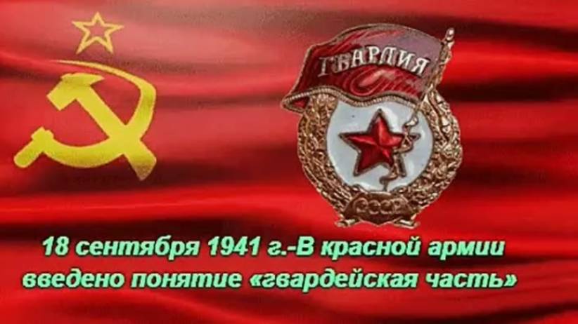 В Красной армии введено понятие «гвардейская часть» Ставкой Верховного Главнокомандования Красной армии 18 сентября 1941 года было введено понятие «гвардейская часть». Это решение было принято через несколько дней после успешной ликвидации советскими войсками так называемого Ельнинского выступа во время Второй мировой войны. Мои контакты: Ютуб- https://www.youtube.com/channel/UC60YqkKksZaT2x-uLcUCCCg ВКонтакте- https://vk.com/oblinova1965 ОК- https://ok.ru/group/59523134783660/video/c4532140 Телеграм- https://web.telegram.org/a/#-1001443284231 BOOJTSY: https://boosty.to/obovsemponenozhku Рутуб: https://rutube.ru/channel/23344395/