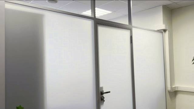 Каркасные перегородки с матовым каленным стеклом 6мм. Перегородки и двери для офиса в аэропорте.