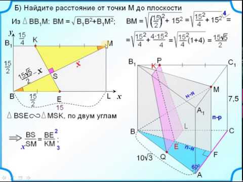Сторона основания правильной треугольной призмы АВСА₁В₁С₁ равна 10 корень из 3, а высота СС₁ равна 7,5. На ребре В₁С₁ отмечена точка Р так, что В₁Р:РС₁=1:3. Точки Q и М являются серединами сторон АВ и А₁С₁ соответственно. Плоскость a параллельна прямой АС и проходит через точки Р и Q. А) Докажите, что прямая ВМ перпендикулярна плоскости a. Б) Найдите расстояние от точки М до плоскости a.