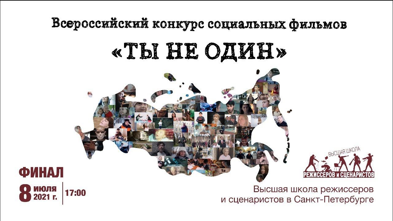 8 июля в 17:00 состоится финал четвертого Всероссийского конкурса социальных фильмов «Ты не один»: показ лучших работ, объявление и награждение победителей. Конкурс проводится среди социальных роликов до 3-х минут и сценариев социальных роликов. Цель конкурса — привлечение внимание общества к социальным проблемам, а также поиск и поддержка талантливой молодежи.