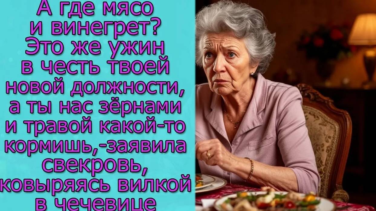 А где мясо ? Это же ужин в честь твоей новой должности, а ты нас зёрнами и травой какой-то кормишь