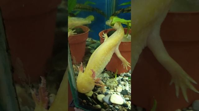 Мама и папа аксолотли и их детки.Детки живут в отдельном аквариуме,чтобы их не съели🙃