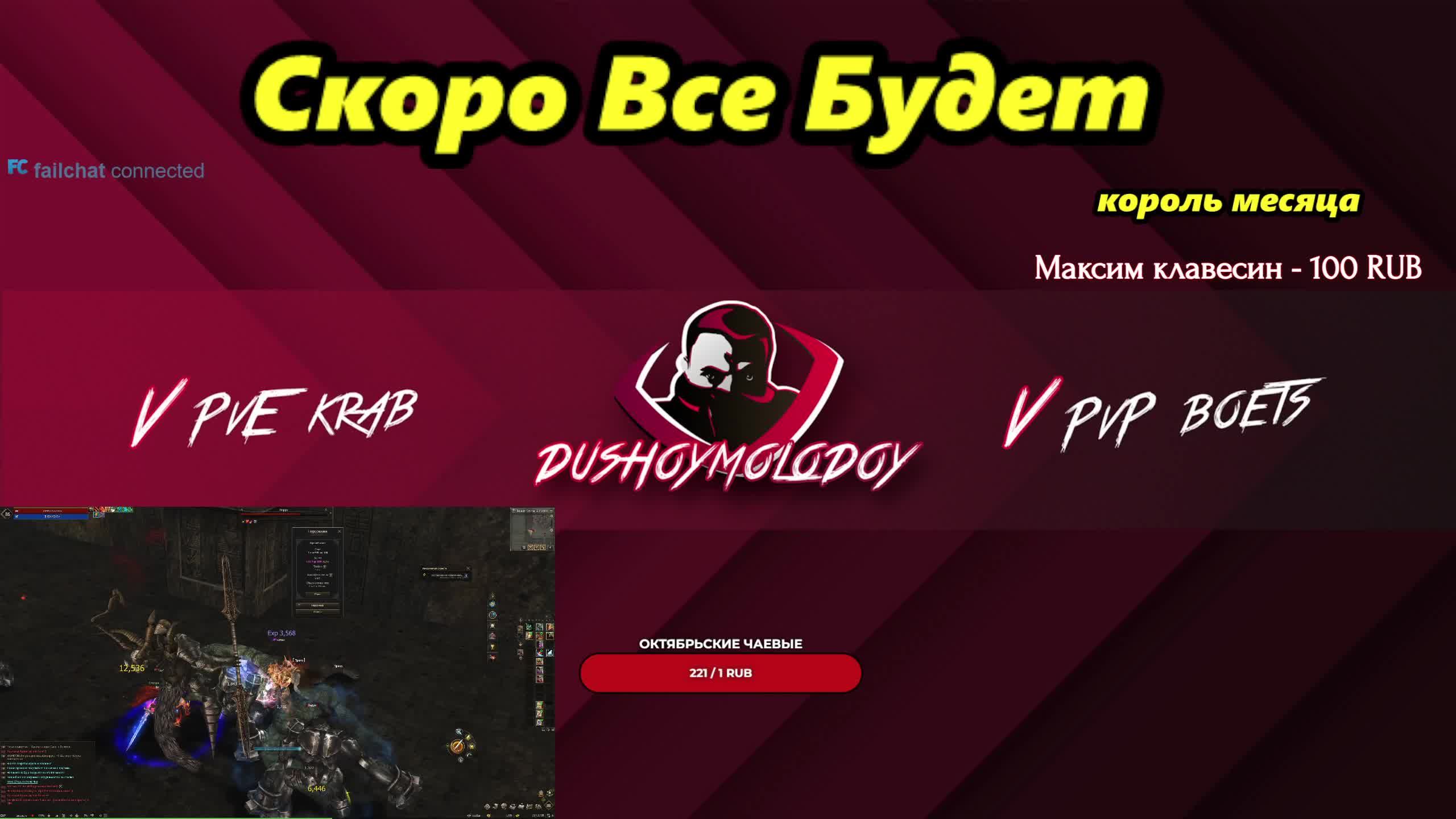💪💪💪Ссылка на сервер с бонусами для новичков и вернувшихся игроков - https://ru.4game.com/s2s/dushoymolodoy_eva (версия Project Eva) https://4ga.me/essence_DushoyMolodoy (версия Essence) https://ru.4game.com/s2s/lineage2_dushoymolodoy (версия Main) https://ru.4game.com/s2s/legacy_dushoymolodoy (версия Legacy). От души благодарю! Получай подарки за предрегистрацию в новой ММО Grand Saga - https://4ga.me/3TdxaO0 Реклама. ООО «Иннова Дистрибьюшен», ОГРН 1077763692720 Erid: 2VtzqwJXVhv Erid: 2VtzqxcGsyT 📢📢📢 Ссылки на все мои социальные сети, где проходят анонсы роликов/стримов: https://t.me/dushoymolodoystream https://discord.gg/RDGqZya https://vk.com/dushoymolodoy Твич канал https://www.twitch.tv/dushoymolodoy Команды в чате: !ref, !tg На всякий случай: 📢📢📢Видеоролики уже дублируются сюда: https://zen.yandex.ru/id/622b53a99fefa169212eff8e 📢📢📢 Стримы будут тут: https://trovo.live/dushoymolodoy Не забывай оценивать видео лайком/дизлайком, это очень помогает в продвижении, а также подписываться на канал. 🌟🌟🌟Поддержать рублем https://www.donationalerts.com/r/dushoymolodoy Огромное спасибо за поддержку. Дай Бог Вам здоровья! 1. peaceducks_ - 21 011 rub 2. ErementarLightning - 15000 rub 3. Амири - 15000 rub 4. Юрий Иванов - 11850 rub 5. vitechek_tu_ru_ru - 10570 rub 6. Gandik - 6576 rub 7. Poggrimmon - 5230 rub 8. CyberHelper - 5000 rub 9. SecretCode - 3665 rub 10. Tangens (Дмитрий) - 3600 rub И всем остальным огромное спасибо за поддержку! Обновлено 04.09.22 #lineage2 #l2main #Lineage2Essence