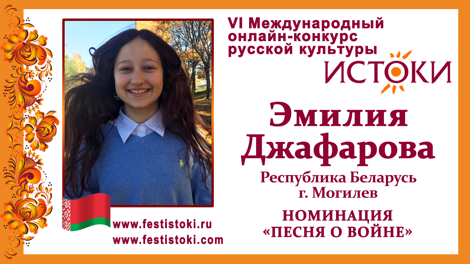 Участник VI Международного онлайн-конкурса русской культуры "Истоки". Номинация "Песня о войне". Песня "Мамины сны". Авторы - И. Матета, Л. Дербенев. Сайт: www.festistoki.ru / www.festistoki.com E-mail: festistoki@mail.ru