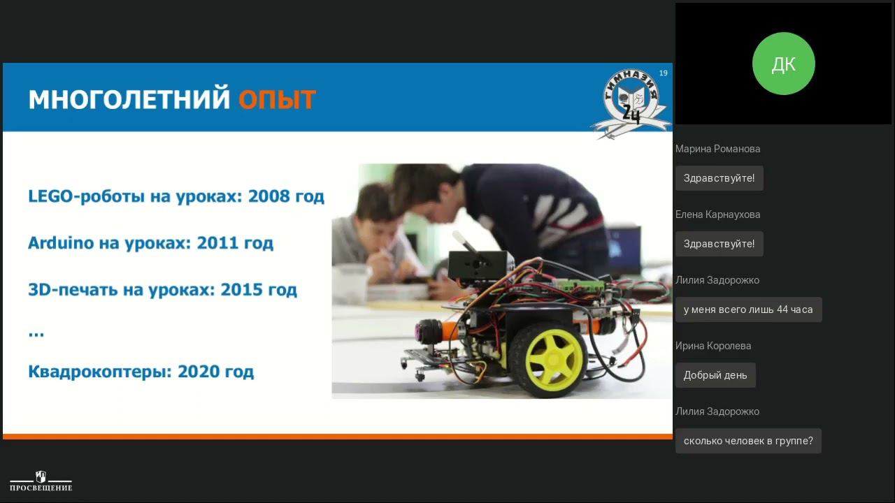 - LEGO SPIKE Prime и квадрокоптеры Tello". Перспективные направления в образовательной робототехнике Спикер - Копосов Денис Геннадьевич, автор учебников по технологии, робототехнике, информатике ГК «Просвещение», учитель информатики и ИКТ МБОУ г.Архангельска "Гимназия № 24", победитель конкурса лучших учителей в рамках ПНП "Образование", руководитель проекта "Начала инженерного образования в школе" - Технология: обновленный ФГОС, ключевые моменты и особенности Спикер - Пичугина Галина Васильевна, д.п.н., проф. Института стратегии развития образования РАО., главный редактор журнала «Школа и производство»