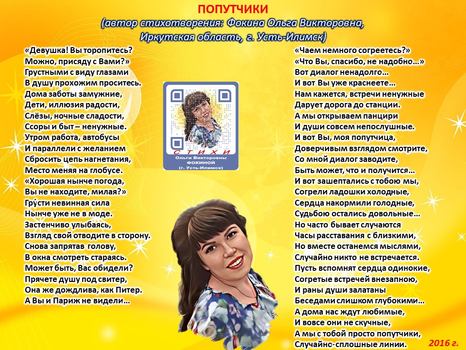 Читает автор стихотворения: ФОКИНА ОЛЬГА ВИКТОРОВНА (Иркутская область, город Усть-Илимск) СТИХИ: https://stihi.ru/2018/07/08/3790 БИОГРАФИЯ: http://www.proza.ru/2019/10/08/1473 ВЫИГРЫВАЙТЕ КНИГИ БЕСПЛАТНО: https://proza.ru/2017/09/17/447 ОТЗЫВЫ ЧИТАТЕЛЕЙ: http://www.proza.ru/2019/11/29/611 Из книги Фокиной Ольги Викторовны (Усть-Илимск) «Несу добро в ладошках!»: [все стихотворения с 2005 по октябрь 2020 гг., проза, авторские песни, интервью]. – Москва: МГО Союза писателей России, 2020 г. – 886 стр., ил. ISBN 978-5-7949-0826-8 ПОПУТЧИКИ (автор стихотворения: Фокина Ольга Викторовна, Иркутская область, г. Усть-Илимск) «Девушка! Вы торопитесь? Можно, присяду с Вами?» Грустными с виду глазами В душу прохожим проситесь. Дома заботы замужние, Дети, иллюзия радости, Слёзы, ночные сладости, Ссоры и быт – ненужные. Утром работа, автобусы И параллели с желанием Сбросить цепь нагнетания, Место меняя на глобусе. «Хорошая нынче погода, Вы не находите, милая?» Гру́сти невинная сила Нынче уже не в моде. Застенчиво улыбаясь, Взгляд свой отводите в сторону. Снова запрятав голову, В окна смотреть стараясь. Может быть, Вас обидели? Прячете душу под свитер, Она же дождлива, как Питер. А Вы и Париж не видели… «Чаем немного согреетесь?» «Что Вы, спасибо, не надобно…» Вот диалог ненадолго… И вот Вы уже краснеете… Нам кажется, встречи ненужные Дарует дорога до станции. А мы открываем панцири И души совсем непослушные. И вот Вы, моя попутчица, Доверчивым взглядом смотрите, Со мной диалог заводите, Быть может, что и получится… И вот зашептались с тобою мы, Согрели ладошки холодные, Сердца накормили голодные, Судьбою остались довольные… Но часто бывает случаются Часы расставания с близкими, Но вместе останемся мыслями, Случайно никто не встречается. Пусть вспомнят сердца одинокие, Согретые встречей внезапною, И раны души залатаны Беседами слишком глубокими… А дома нас ждут любимые, И вовсе они не скучные, А мы с тобой просто попутчики, Случайно-сплошные линии. 9 октября 2016 г.