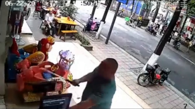 В Китае мужчина, вооруженный мечом, напал на магазин, но владелец лавки не испугался и дал отпор, используя нож и кухонный топорик.