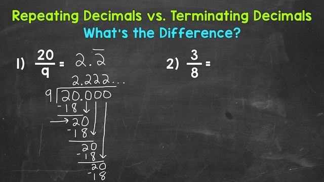 Welcome to Repeating and Terminating Decimals with Mr. J! Need help with the difference between repeating decimals and terminating decimals? You're in the right place! Whether you're just starting out, or need a quick refresher, this is the video for you if you're looking for help with the difference between repeating and terminating decimals. Mr. J will go through a repeating decimal example and a terminating decimal example. More Repeating Decimals Videos: ✅ What are Repeating Decimals and How Do They Happen?: https://youtu.be/v5wkmlcUMOY ✅ Repeating Decimals vs. Terminating Decimals: https://youtu.be/Jf_-FfaMMZM ✅ How to Write Repeating Decimals Using Bar Notation: https://youtu.be/ZhYoonUFMfg ✅ How to Round Repeating Decimals: COMING SOON About Math with Mr. J: This channel offers instructional videos that are directly aligned with math standards. Teachers, parents/guardians, and students from around the world have used this channel to help with math content in many different ways. All material is absolutely free. Click Here to Subscribe to the Greatest Math Channel On Earth: https://goo.gl/XHTrfY Follow Mr. J on Twitter: @MrJMath5 Email: math5.mrj@gmail.com Music: https://www.bensound.com/royalty-free-music Hopefully this video is what you're looking for when it comes to repeating decimals and terminating decimals. Have a great rest of your day and thanks again for watching! ✌️✌️✌️