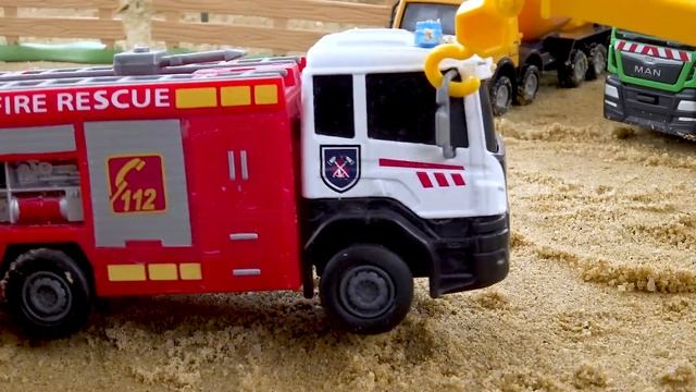 Строительная машина падает в глубокую яму и помогает автокрану и грузовику с песком