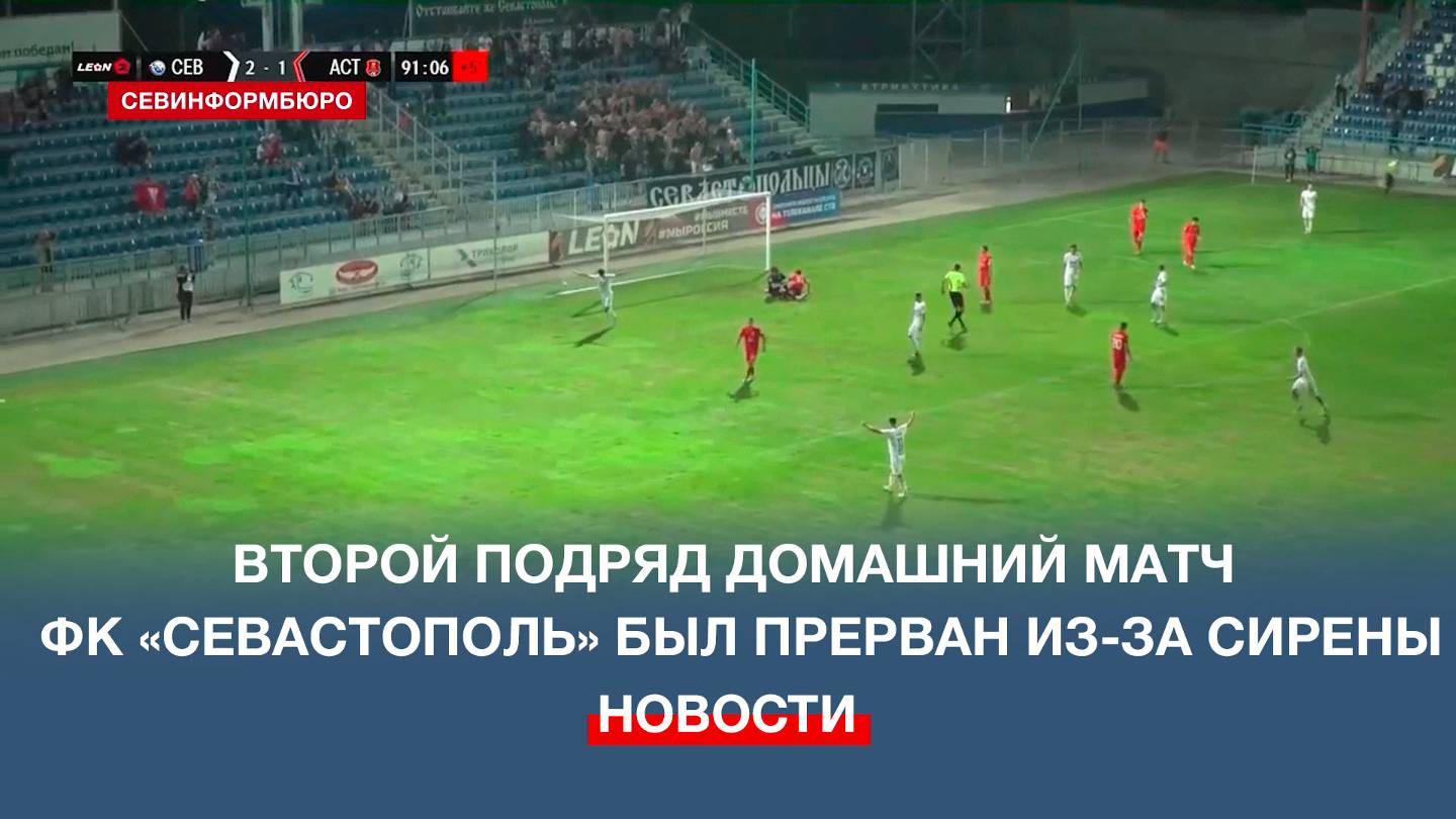 Второй подряд домашний матч ФК «Севастополь» был прерван из-за сирены. Воздушная тревога была объявлена перед самым стартом встречи нашей команды против «Астрахани». Через 20 минут соперники вернулись на поле и выдали результативное начало. Открыли счёт гости – гол забил камерунский легионер «Астрахани» Пачо. Вскоре «Севастополь» ответил точным ударом Александра Смирнова. Подписывайтесь на наш Телеграм-канал: https://t.me/nts_novosti Смотрите новости Севастополя и Крыма на сайте НТС: http://nts-tv.com В нашей группе "ВКонтакте": https://vk.com/ntssevastopol На странице в "Одноклассниках": https://ok.ru/ntssevastopol