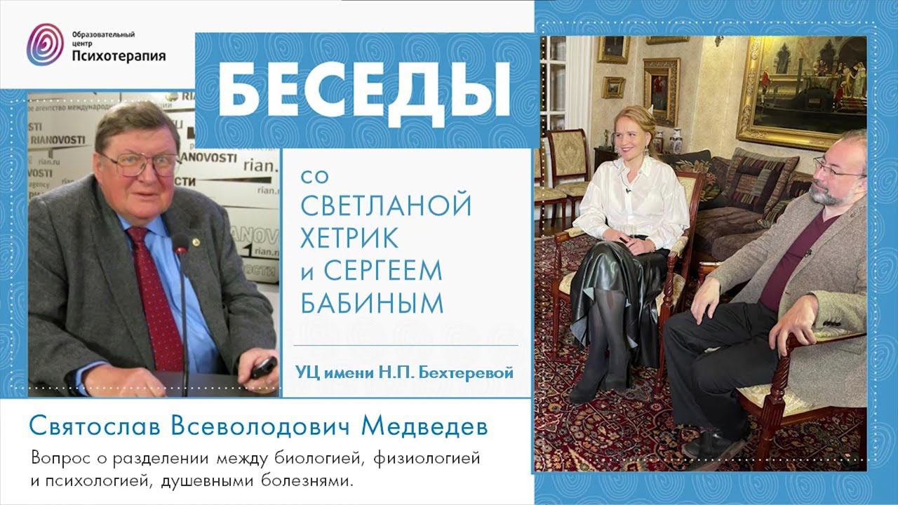 Беседы со Светланой Хетрик и Сергеем Бабиным. С. В. Медведев "О разделении между биологией, физиологией и психологией, душевными болезнями". Святослав Всеволодович делится своими размышлениями о том, почему есть разделение наук о мозге и психики человека, почему одни занимаются психофизиологией, а другие больше говорят о душе и душевных заболеваниях, о том, как физика связана с изучением мозга и как современные представления о мире пересекаются с буддистскими описаниями. Приглашаем всех на новый курс физиолога, академика РАН и директора Института мозга человека РАН С. В. Медведева, под названием “Новеллы о мозге” https://psy.education/novelly-o-mozge/