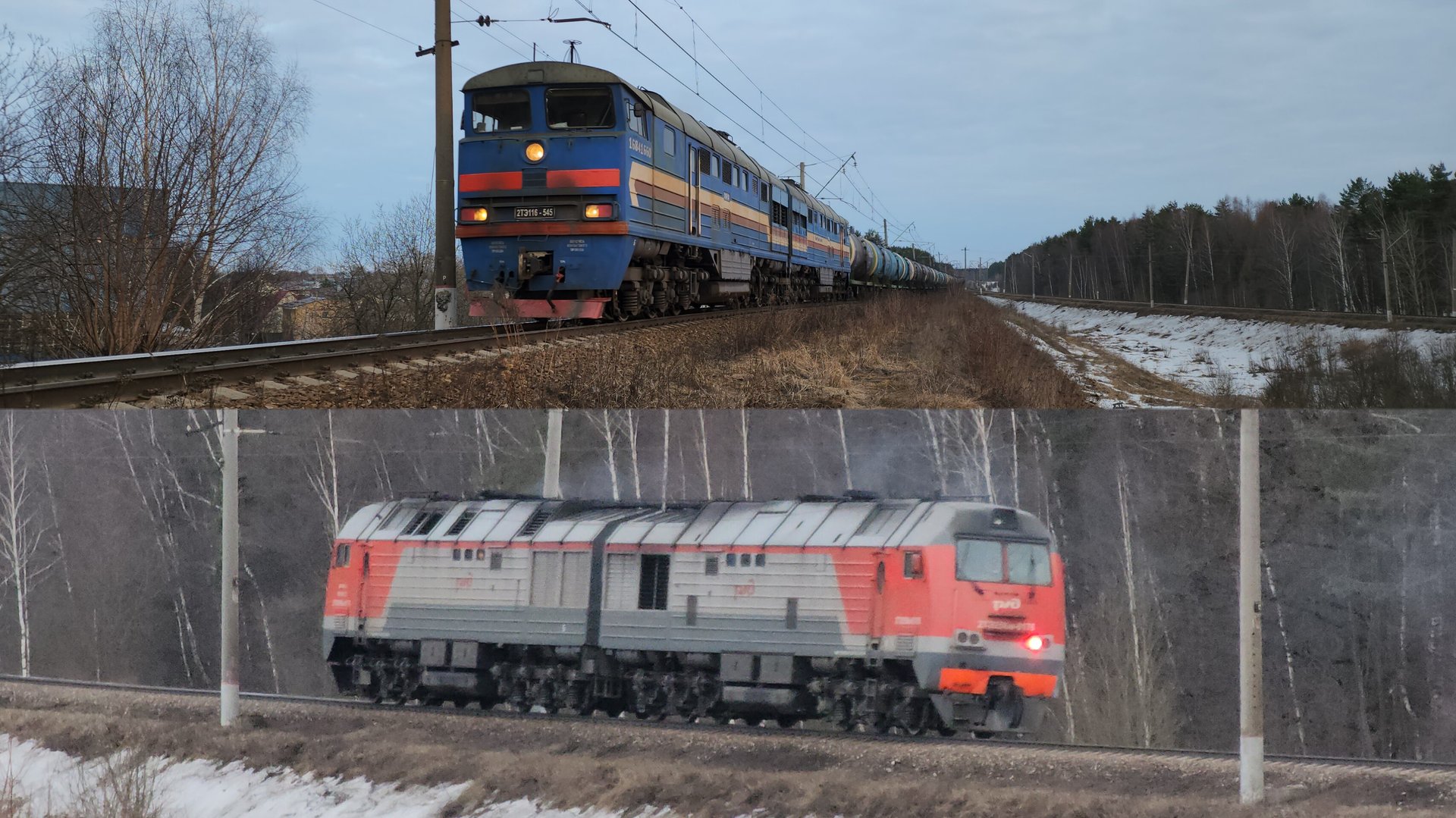 23 марта 2023 года окрестности станции Сандарово БМО Московская железная дорога 0:01 - 2ТЭ116-545 БТС с "бочками" на Сандарово в 18:19 2:51 - 2ТЭ25КМ-0176 резервом из Сандарово в 18:22
