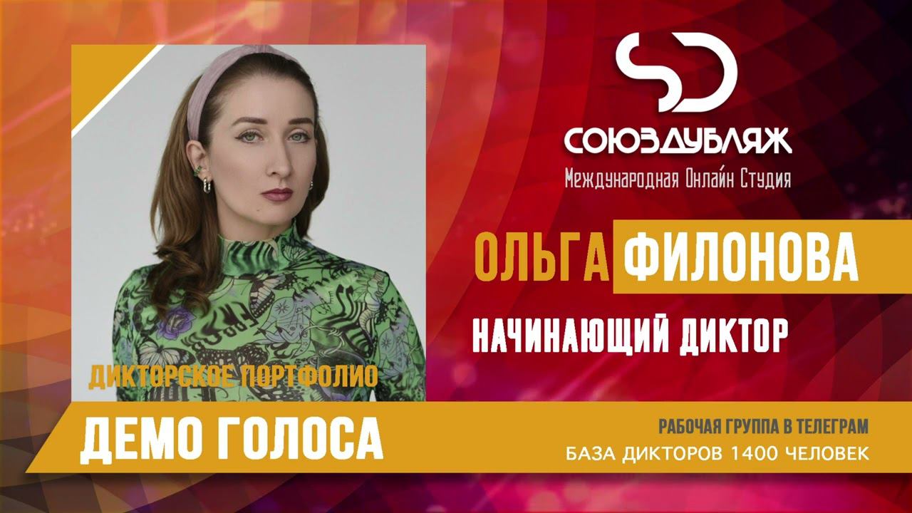 #СоюзДубляж #БазаДикторов #Озвучка ✔️Ольга Филонова, начинающий диктор озвучивания. Международная Онлайн-Студия "СОЮЗДУБЛЯЖ" - профессиональная озвучка и дубляж. ▪️Рабочая группа в Телеграм: https://t.me/soyuzdubliazh ▪️Контакт для связи: https://t.me/SoyuzAdmin ▪️Подпишись:https://www.youtube.com/c/SOYUZDUBLIAZH ▪️Сайт: https://www.soyuzdubliazh.com/ Лучшие голоса для вашей аудиорекламы и видеороликов. База дикторов - 5 000 человек, профессионального уровня на ENG| FR| TR| RU| ISR| AZ| UA| KZ| UZ| языках. Мужские и Женские топовые голоса для озвучки любых проектов, таких как: Рекламы, Презентации, Фильмы, Сериалы, Игры, Мультфильмы, ТВ Шоу, Аудио-видео визитки. ✔️Сотрудничая с нами вы получаете свой проект под ключ, не выходя из дома или офиса. Наша слаженная команда из лучших дикторов, актёров озвучивания, режиссёров и звукорежиссёров в кратчайшие сроки озвучат или отдублируют ваш заказ на профессиональном уровне. Образцы работ нашего портфолио вы сможете посмотреть на канале СОЮЗДУБЛЯЖ. ВНИМАНИЕ: ✔️Мы приглашаем специалистов озвучки к сотрудничеству в нашей команде. Вы можете пройти по ссылке в наш телеграм канал и связаться с Админом для обсуждения. ✔️Всем заказчикам подобных медиа проектов по озвучки и дубляжу фильмов, сериалов, документалок обращаться непосредственно к Админу Телеграм группы СОЮЗДУБЛЯЖ, пройдя по ссылке: Проходи по ссылке: https://t.me/soyuzdubliazh International Online-Studio SOYUZDUDLIAZH presents a highly professional approach in voice-over and dubbing. ▪️Our working group https://t.me/soyuzdubliazh ▪️Chief manager https://t.me/SoyuzAdmin ▪️Follow https://www.youtube.com/c/SOYUZDUDLIAZH ▪️Web: https://www.soyuzdubliazh.com/ We offer You the best Voices for your Audio commercials and Video`s. Our Database contains over 5 000 voices of native speakers and high-class foreign language specialists in ENG| FR| TR| RU| ISR| AZ| UA| KZ| UZ|. Male & Female top level voices for all the variety of dubbing projects such as commercials, presentations, movies, TV-series, video and computer games, cartoons, TV-shows, audio & video portfolio’s – all in one place. As your business partner we guarantee a turn-key project without you leaving your house or office. Our target is to make sure that the dubbing of your project is made as quick as possible by a well-coordinated and professional team of the best speakers, film and sound directors. To whom it may concern! We invite dubbing specialists to join our team. Please contact our manager on Telegram https://t.me/soyuzdubliazh