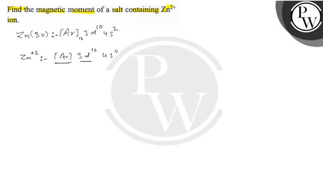 Find the magnetic moment of a salt containing Zn^2+ ion. 📲PW App Link - https://bit.ly/PW_APP 🌐PW Website - https://bit.ly/PW_APP 📌 PHYSICS WALLAH OTHER CHANNELS : 🌐 PhysicsWallah -Alakh Pandey: https://youtube.com/@PhysicsWallah 🌐 Alakh Pandey: https://youtube.com/@alakhpandey1414 🌐 JEE Wallah: https://youtube.com/@jee_wallah 🌐 Competition Wallah: https://youtube.com/@competitionwallah 🌐 PW Foundation: https://youtube.com/c/PhysicsWallahFoundation 🌐 NCERT Wallah : https://www.youtube.com/channel/UC8zCnnfhz-dvIpVdZ1CheuA 🌐 Defence Wallah-NDA: https://youtube.com/channel/UC8OCoGX9tmMneOzIFUTWq2Q 🌐 PhysicsWallah English: https://youtube.com/@EnglishPW 🌐 PW Vidyapeeth: https://youtube.com/@VidyapeethPW 🌐 Commerce Wallah by PW: https://youtube.com/@commercewallahpw 🌐 CA Wallah bt PW: https://www.youtube.com/channel/UC2amkJX5zDyQJ0mDajAWRSA 🌐 PW Sarkari Exam: https://youtube.com/@PWSarkariExams 🌐 PW - Hindi Medium: https://youtube.com/@physicswallahhindimedium 🌐 PW Bangla: https://youtube.com/@pwbangla 🌐 PW Maharashtra: https://youtube.com/@PWMaharashtra 🌐 PW Telugu: https://youtube.com/@PWTelugu 🌐 PW Kannada: https://youtube.com/@PWKannada 🌐 PW Gujarati: https://youtube.com/@PWGujarati 🌐 PW Facts: https://youtube.com/@pwfacts 🌐 PW Insiders: https://youtube.com/channel/UCHMWQFr9Nwo3wJsAap2Wnfw 🌐 PW Little Champs: https://youtube.com/@pwlittlechamps 🌐 PW Pathshala: https://youtube.com/channel/UCcXUY9NSMyYbkOvUD97CUmA 🌐 Banking Wallah : https://www.youtube.com/channel/UCg5_K50hLTKerLkSE7I1yWQ 🌐 SSC Wallah : https://www.youtube.com/channel/UCcaEVV7A47J4k9GFcqOOYkg 🌐 JEE Challengers by PW : https://www.youtube.com/channel/UCyf71tWV2abeN-l_UKiJ-5g 🌐 UPSC Wallah : https://www.youtube.com/channel/UCqOy6oOu6RPJNHYQ8f_Ybvg 🌐 UPSC Wallah हिन्दी : https://www.youtube.com/channel/UCmrP-DYdZuThp8AO9lnnwNw 🌐 GATE Wallah : https://www.youtube.com/channel/UC9PoSJoftLvEnXT-PtQ5Wtw 🌐 GATE Wallah - EC,EE & CS : https://www.youtube.com/channel/UCuGWIkiNaWjsCqybgxGuxfg 🌐 GATE Wallah - ME, CE & XE : https://www.youtube.com/channel/UCGrrw9x3_B_fItUIBMvqAUw 🌐 GATE English : https://www.youtube.com/channel/UCOsV75fSUr8gnMbhx-Qh3Lg 🌐 College Wallah : https://www.youtube.com/channel/UCDrf0V4fcBr5FlCtKwvpfwA 🌐 PW IIT JAM & CSIR NET : https://www.youtube.com/channel/UCuj28Zll58sztDqLiDhzgtQ 🌐 MBA Wallah : https://www.youtube.com/channel/UCWWEvCschv0T0rtou4VaKGw 🌐 Teaching Wallah : https://www.youtube.com/channel/UCUzqJZOkCejFoc5eqWWA9Eg 📌 PHYSICS WALLAH SOCIAL MEDIA PROFILES : 🌐 Telegram : https://t.me/pwjeewallah 🌐 Facebook : https://www.facebook.com/physicswallah 🌐 Instagram : https://www.instagram.com/pwjee_wallah/?hl=en 🌐 Twitter : https://twitter.com/physics__wallah 🌐 Linkedin : https://www.linkedin.com/company/78087354/admin/ 📌 For any queries or complaints Visit : https://bit.ly/PW_Queries