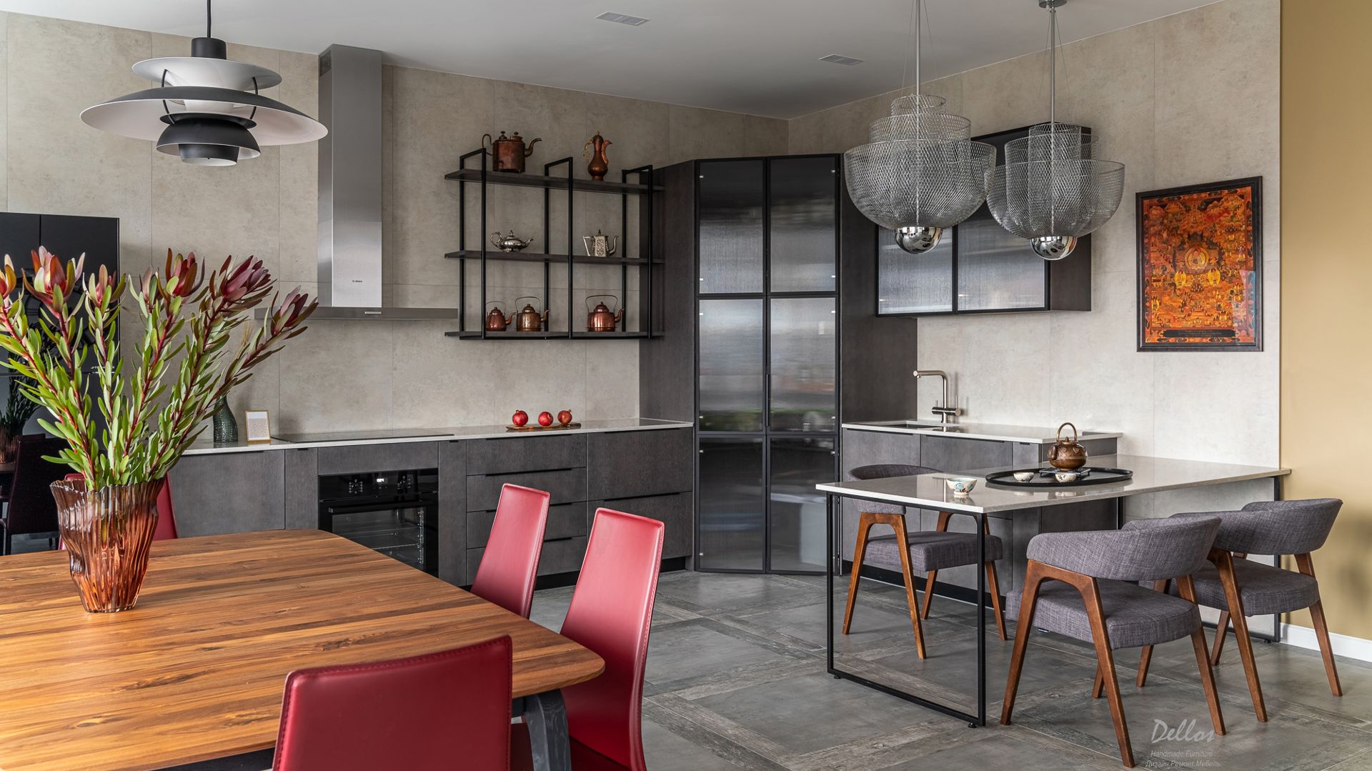 «Москва» это новый жилой комплекс бизнес-класса рядом с площадью Победы, в престижном Московском районе Санкт-Петербурга. Трехкомнатная квартира в смешанном стиле полностью разработана студией дизайна интерьера Марины Мурашевой. Интерьер выполнен с уклоном на 60-е годы, необычное дизайнерское решение. Трехкомнатная квартира в смешанном стиле полностью разработана студией дизайна интерьера Марины Мурашевой. Интерьер выполнен с уклоном на 60-е годы, необычное дизайнерское решение. Кухня: Фасады из шпона дуба, покрыты эмалью по выбранному тону из раскладки NCS . Фасады из алюминиевого профиля имеют декоративное стекло ribbed. Столешница изготовлена из кварцевого агломерата толщиной 20мм. Выдвижные механизмы последнего поколения intivo и петли CLIP top BLUMOTION , Австрийского производителя BLUM. Техника встроенная, за исключением холодильника Side-by-Side. Подсветка под верхними модулями, открытой настенной конструкции и внутри углового шкафа – светодиодная, включается на взмах руки. Гостиная комната: Корпуса комодов из МДФ покрытого шпоном дуба покрыты матовой эмалью по раскладке NCS. Деревянные части из дуба в отделке матовый лак. Выдвижные ящики tandem blum мягкого и бесшумного хода с доводчиками. Пристенная консоль из кварцевого агломерата толщиной 30мм. Складные двери в алюминиевой рамке со стеклом ribbed верхнего подвеса. Зеркала вокруг портала с картиной, увеличивают пространство. Спальная комната: Вместо прикроватных тумб, полки на скрытом крепеже triada. Встроенный шкаф для одежды из экологически чистого МДФ производства M.Kaindl не выделяет формальдегиды. Комод из МДФ шпонированного дубом имеет выдвижные ящики tandem blum мягкого и бесшумного хода с доводчиками. Мебель в душевой и ванной комнате: Тумба под раковиной на тонких ногах в стиле 60-х. Мойка из акрилового камня так же изготовлена на заказ. Перегородка в душ изготовлена из профиля с закаленным стеклом 8мм. Фурнитура для распашной двери Bohle. Тумба под мойкой и шкаф-пенал для стиральной и сушильной машины – из МДФ покрыты эмалью в цвет по раскладке NCS.