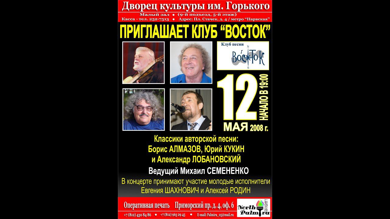 Приглашает клуб песни «Восток». Классики авторской песни Юрий Кукин, Борис Алмазов и Александр Лобановский. В концерте принимают участие молодые исполнители Евгения Шахнович и Алексей Родин. Ведущий Михаил Семененко. 12 мая 2008 г. Санкт-Петербург, пл. Стачек, д. 4. ДК им. М. Горького. Видеозапись - Алла Левитан.