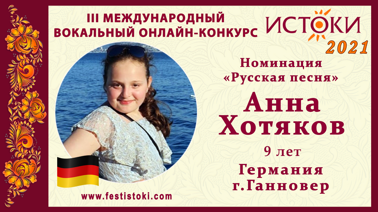 Дипломант III Международного вокального онлайн-конкурса «Истоки». Номинация "Русская песня". Песня "Леди совершенство". Композитор Максим Дунаевский, стихи: Н. Олев. Сайт: www.festistoki.ru / www.festistoki.com E-mail: festistoki@mail.ru