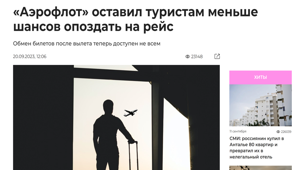 Новости туризма 20/09/2023 «Аэрофлот» оставил туристам меньше шансов опоздать на рейс #туризм