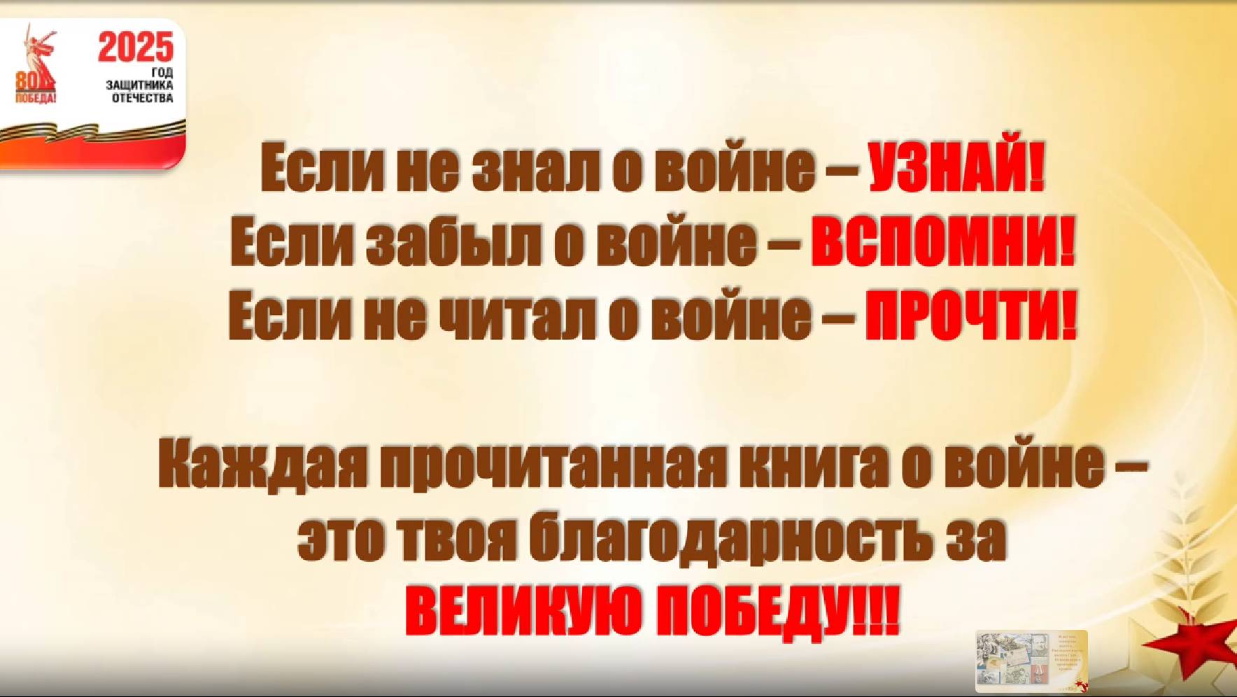 В рамках онлайн-марафона «80 историй о Войне. Мы помним. Мы гордимся!» заведующая Переясловской библиотекой — филиал №3 Цыганкова Светлана Владимировна подготовила буктрейлер по книге Елены Ильиной «Четвёртая высота». #ГОД_ЗАЩИТНИКА_ОТЕЧЕСТВА_2025 #Победа80 #Онлайн_марафон_80историйоВойне_Мыпомним_Мыгордимся #БиблиотекиРыбинскогорайона