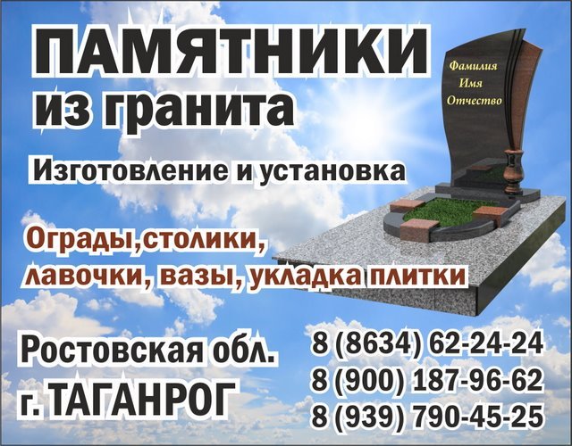 Изготовление и установка памятников из гранита в Таганроге. Ограды, столики, лавочки, укладка плитки. Ритуальная мастерская в Таганроге предлагает свои услуги: - Изготовление и установка памятников из гранита. - Установка столов, лавок, ваз, лампад, оградок, укладка тротуарной плитки. - Предоставляем беспроцентную рассрочку от производителя. - Выдаем документы для получения компенсации за памятник умершим (погибшим) участникам ВОВ, боевых действий, инвалидам ВОВ, ветеранам вооруженных сил РФ и другим льготным категориям граждан. На рынке услуг с 1996 года. Работаем с понедельника по пятницу с 9-00 до 18-00, суббота с 9-00 до 14-00, воскресенье выходной. Прием заказов по адресам: Ростовская обл., г. Таганрог, ул. Дзержинского, 128-А Тел.: 8 (8634) 62-24-24 Тел.: 8 (900) 187 96 62 Ростовская обл., г. Таганрог, Мариупольское шоссе, 34 ДНТ "Восход", д.13 Тел.: 8 (939) 790 45 25 Тел.: 8 (951) 503 97 63 Ростовская обл., Неклиновский р-н, с. Покровское, ул. Привокзальная 5-Г Тел. 8 (950) 860 43 19 В Интернете (в поисковиках) нас находят, в частности, по таким словам: изготовление памятников Таганрог, установка памятников Таганрог, изготовление памятников из гранита Таганрог. #изготовлениепамятников #Таганрог #установкапамятников #Неклиновскийрайон #изготовлениепамятниковизгранита #Ростовскаяобласть #Покровское