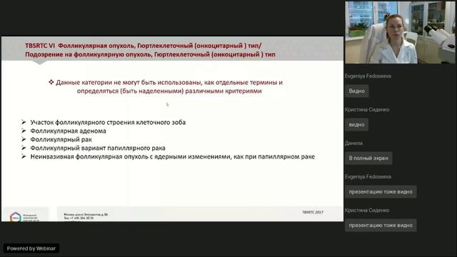 На вебинаре освещены вопросы диагностики узловых образований щитовидной железы и их классификации по системе Бетесда. Рассмотрены возможности и преимущества различных способов пробоподготовки, в том числе жидкостной техники. Представлены примеры цитологического материала в зависимости от методов подготовки проб. Спикер: Путова М.В., биолог клинической лабораторной диагностики МКНЦ им. А.С. Логинова, член ассоциации ФЛМ и клинических цитологов России, спикер Российских Международных конференций