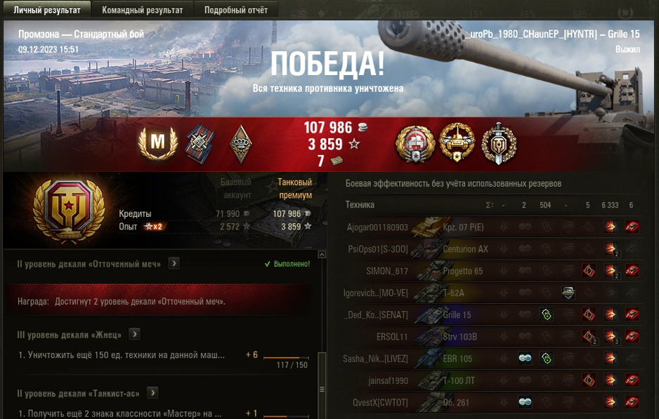 ПРОМЗОНА МАСТЕР на Grille 15 ОПЫТ: 1143 СУММАРНЫЙ УРОН: 6837 медаль СНАЙПЕР ВОИН и КАЛИБР